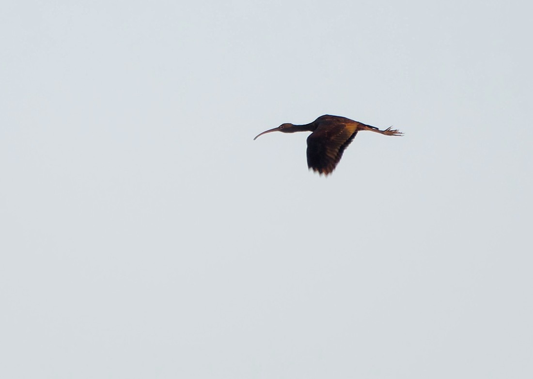After 43 years of recording birds on the Reserve it gets ever harder to add a new species to the list. So, Dan Owen and I were delighted to watch a Glossy Ibis arrive from the north-east and fly steadily westward across the No.3 bed lagoon before disappearing from sight. Glossy Ibis breed in heronries across southern Europe, feeding in shallow water on frogs and small fish. There has been a recent surge in breeding numbers in Southern Spain and particularly in Coto Donana, with a resultant increase in UK records. It provided us with our 245th species ever for the Reserve and the 149th of this year. With that under our belts we wandered down to Bollin Point, having close views of a Siberian Chiffchaff (one of two ringed in the past week), as well as a Woodcock and 2 Goldeneyes. Back in No.3 bed, the two Marsh Harriers, which have been around, appeared and at last we were able to get record shots of the wing-tagged individual, which will enable us to get detailed information on when and where it was originally ringed and tagged. Finally, we did a quick circuit of No.4 bed, finding 3 Jack Snipe, 13 Common Snipe, an over-flying male Goosander and a hunting Peregrine. Quite a morning! Record shot of the Glossy Ibis Cheers David