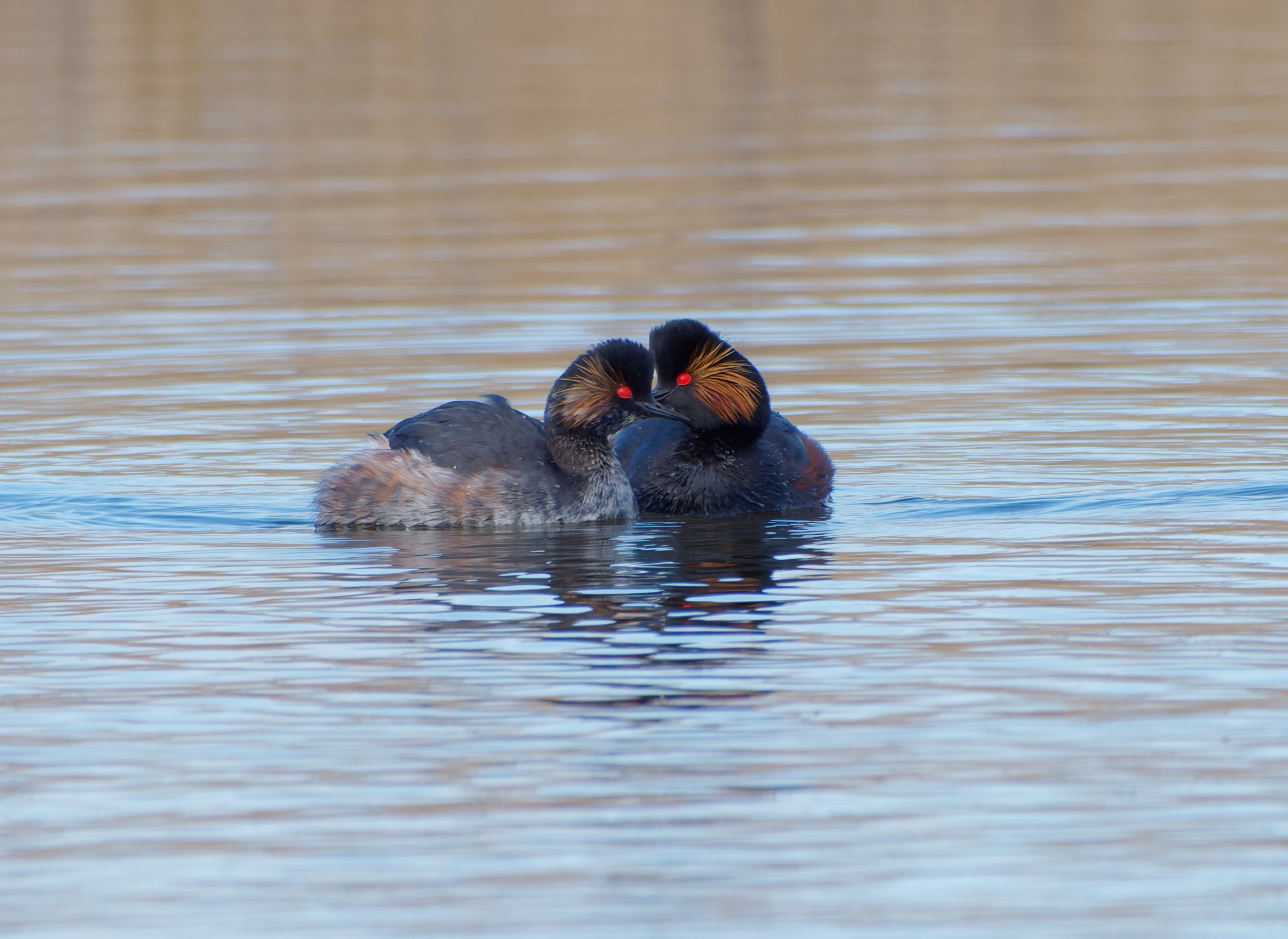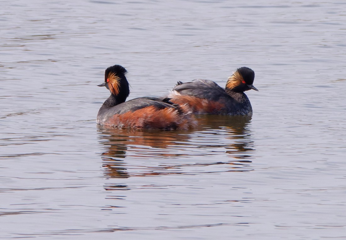 When the sky is clear overnight in early spring there is always the chance of an early-arriving Black-necked Grebe. Early on there was no sign of any on No.3 bed, though 250 calling and displaying Black-headed Gulls, loads of Bramblings and 54 Pochard provided plenty of interest. Ever hopeful, though, we set off for the new wetland on No.4 bed, where a Curlew in song was a good start. Soon enough 3 Black-necked Grebes drifted into sight, calling, confirming that spring on the Reserve has well and truly arrived. Also present were a pair each of Pintails and Wigeon, always relatively scarce birds for us, plus a handful of Bramblings and Siskins. Back on No.3 bed 3 more Black-necked Grebes appeared and were typically very active, roaming around the bed checking out possible nest sites. Then a Marsh Harrier got up out of the reed-bed which, from its plumage, was the fourth different one we’ve seen over the past month or so. While the others were surely wintering birds, my guess is that this one is a passing migrant. Finally, my attention was drawn to two mobbing Buzzards at great height, which were harassing a passing Red Kite. A nice end to a pretty special day. Photo of a pair of Black-necked Grebes Cheers David Bowman (with Daniel Owen, Helen Wynn, Dave Steel, Brian Baird and Sue Haddock)