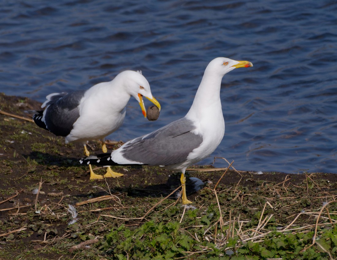 A cold south-easterly breeze with clear blue skies failed to produce the hoped-for appearance of our first Sand Martin of the spring. With the winds staying from the south but becoming warmer, however, the next couple of days could see a few more migrants starting to trickle through. There was still plenty to enjoy, though, with counts across both Nos.3 and 4 beds producing highlights of: 5 Black-necked Grebes, 1 adult Mediterranean Gull, 2 Ravens, 1 Marsh Harrier, 18 Little Grebes, 100 Bramblings, 4 Grey Wagtails, 6 Redwings and 6 Water Rails. Photo of displaying Lesser Black-backed Gulls Cheers David Bowman (with Daniel Owen)