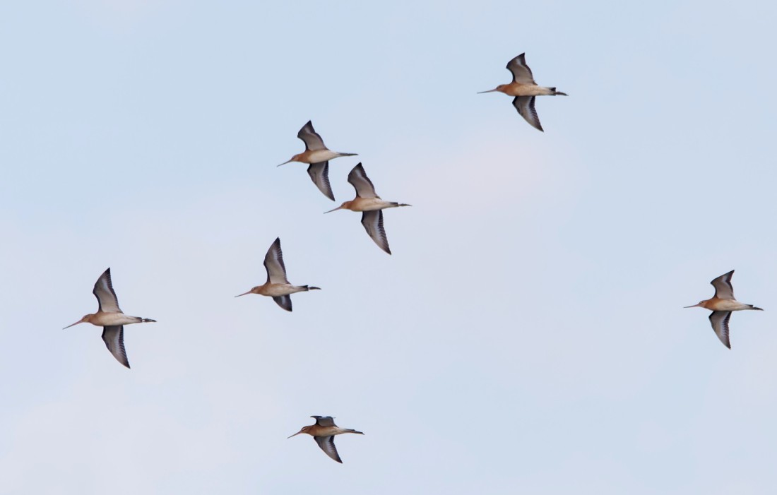 We don’t usually have our first session of visible migration watching till September. Today, though, the weather was so nice we decided to settle ourselves on the viewing platform overlooking the No.4 bed wetland and see what passed over. It turned out to be a good decision and by the end of the morning we had enjoyed highlights of: 1 Tree Pipit (amazingly, the 25th sighting so far this month), 3 Yellow Wagtails, 15 Black-tailed Godwits, 2 Redshanks, 4 Green Sandpipers, 10 Snipe, 1 Little Egret, 1 Peregrine, 52 Swallows, 16 Sand Martins, 36 House Martins and perhaps less pleasingly, 1 Ring-necked Parakeet. These predominantly green, long-tailed parakeets are the UK’s most abundant naturalised parrot, with a population approaching 10,000 pairs. Initially established in the south of England in the 1960s, they have steadily spread northwards and are now well established in the Manchester area, where hundreds roost not far from the city centre. The jury is still out on their likely impact on our native breeding birds. Photo of some of the godwits. Cheers David Bowman (with Dave Steel and Helen Wynn)
