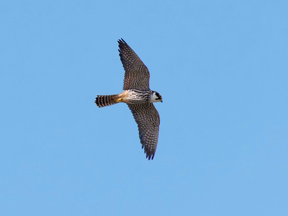 The conditions this morning looked good for visible migration, with blue skies and a fresh north-easterly breeze. I started at dawn on No.3 bed, where a juvenile Water Rail was in front of the Morgan Hide, along with 3 Green Sandpipers, 6 Black-tailed Godwits, 8 Snipe, a juvenile Marsh harrier and a Kingfisher. A single Swift, beating its way south, was a nice late sighting, too. I then joined Dan Owen on the new No.4 bed wetland, where he had already noted 3 Garganeys, 11 Black-tailed Godwits, 3 Green Sandpipers and 2 Snipe. Over the next five hours we were treated to 1 Tree Pipit (our 25th so far this month!), 2 Greenshanks, another Green Sandpiper, 3 more Swifts, 41 Swallows, 13 Sand Martins and 10 House Martins. The morning finished well, with a Hobby arriving to catch dragonflies in front of the viewing platform. Hobbies usually hunt dragonflies by hawking for them as they rise on warm air. In these cool conditions, however, this little immature male was making high speed stoops to snatch them as they skimmed just above the water., before dismembering and eating them on the wing. Photo of the Hobby Cheers David Bowman