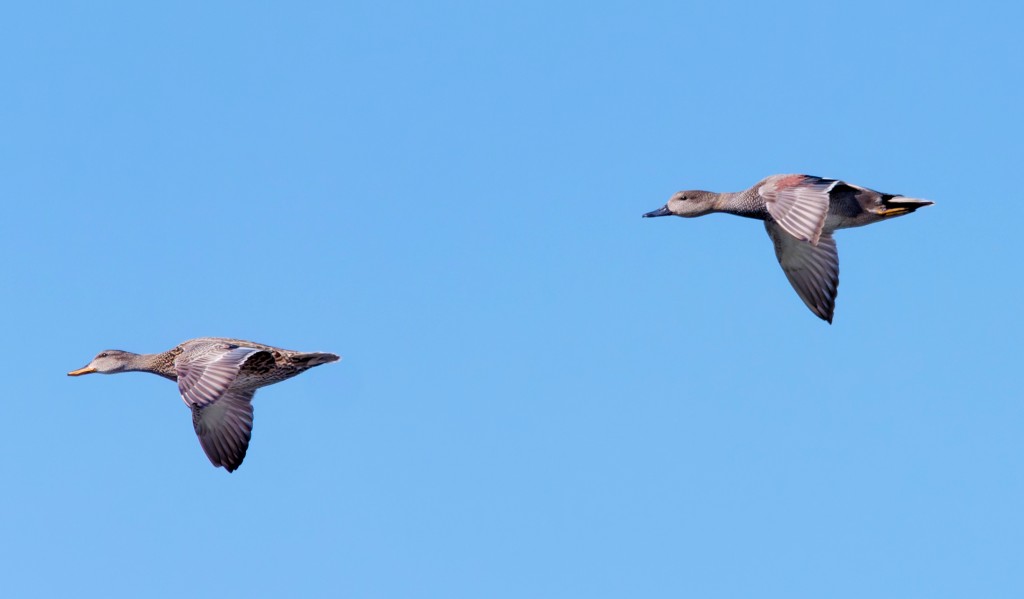 That was a spectacular spring morning, frosty at dawn but becoming genuinely warm, followed by some great birds and a nice surprise at the end. As is often the case, most of the best sightings were early on, with a Cuckoo callling on No.3 bed, where 3 Pintail were also in a courtship chase, again raising hopes that these very scarce ducks will stay to breed. No.4 bed produced Wood Sandpiper, Ruff, a very early Swift, Little Ringed Plovers, Common Sandpiper, Lesser Whitethroat, plus Yellow and White Wagtails, the first two of which are very scarce visitors to the Reserve. We were just settling for lunch in the Morgan Hide when 2 adult Mediterranean Gulls flew in, followed shortly by a call to let us know that the Hoopoe, which had turned up on Rixton Moss yesterday had been relocated. The moss is barely half a mile from the north-east boundary of the Reserve so we were soon there and enjoying great views of this charismatic migrant from Africa, which has over-shot its breeding grounds in Southern Europe and is a very rare bird to see in Cheshire. Photo of a pair of Gadwall in flight Cheers David Bowman (with Dan Owen)