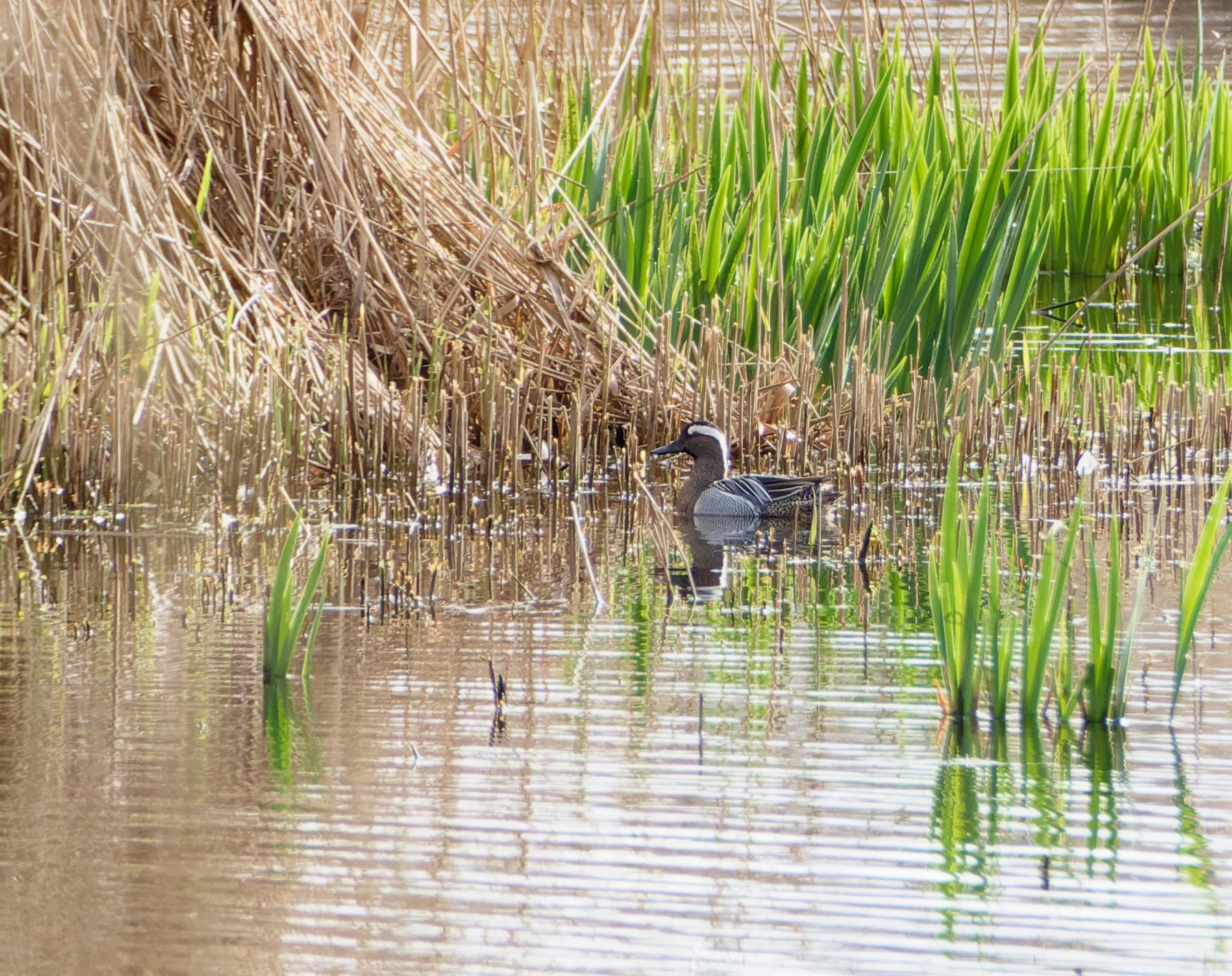 It was an excellent morning for variety. Between us, Dan and I covered No.3 and 4 beds, before joining forces on the latter. Initial totals included: 1 Sedge Warbler, 2 Reed Warblers, 15 Black-necked Grebes, 3 Marsh Harriers, 2 adult Mediterranean Gulls, 2 Little Ringed Plovers, 5 House Martins, 9 Swallows, 350 Sand Martins, 1 Fieldfare, 22 Redwings, 7 Willow Warblers, 9 Blackcaps and 64 Chiffchaffs. The best came mid-morning, though, when two Garganey gave close views just before Dan scoped a very distant swift sp., possibly an Alpine Swift. By the time I got on to it it was impossible to see any detail which was extremely frustrating. as it continued to drift away over No.2 bed before eventually being lost to sight. Record shot of the drake Garganey Cheers David Bowman (with Dan Owen)