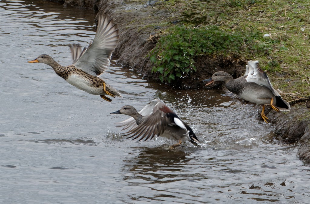 Well, that was another wonderful spring morning, with a hard frost and an enveloping ground mist at dawn, followed by warm sunshine and some nice birding surprises. We started in the Morgan Hide where a tern proved impossible to identify as it flitted through the mist, though it was probably the Common Tern which was around later in the morning. The Sand Martin roost on the bed continues to hold plenty of birds, with a minimum of 500 estimated overnight. Then it was a full survey of No.1 bed before a chilled couple of hours scanning from the viewing platform on No.4 bed. Highlights included: three Goosanders (a male and two females) in an area where they’ve bred before, two Ringed Plovers, five Little Ringed Plovers, four Black-necked Grebes on the new wetland and most unexpectedly, two Barnacle Geese which flew over No.4 bed and seemed to drop in to No.3 bed. As the day warmed, butterflies started to appear, with 1 Speckled Wood, 2 Orange Tips, 1 Peacock and 5 Small Tortoiseshells noted. Photo of a Gadwall courtship chase. Cheers David Bowman (with Dan Owen and Brian Baird)