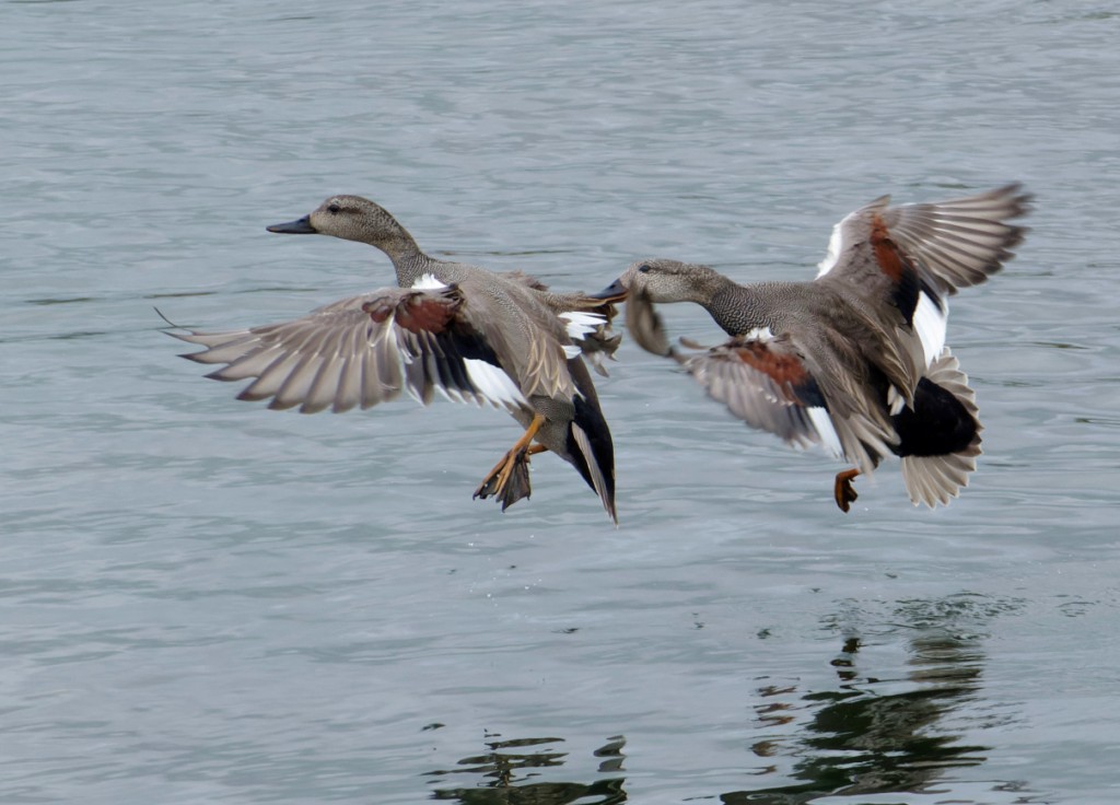 A cool, blustery westerly didn’t stop a steady trickle of passage this morning. On No.4 bed a Yellow Wagtail flew north while a Redwing sat and sang, prior to its long north-easterly journey to its Scandinavian breeding grounds. Two early Common Terns arrived on No.3 bed from the east, one of which stayed to try and feed, despite the attentions of the Black-headed Gulls. Just 420 of the latter were present, which is low by our normal standards for this time of year, so we’re hoping for an influx as the weather warms. Similarly with Black-necked Grebes, as we located just 11, though I’m sure quite a few are already on nests. Warmer weather will surely bring in plenty more. Hirundine passage was steady all morning, with 19 House Martins, 60 Swallows and 320 Sand Martins by lunchtime. Courtship activity among the wildfowl was constant, too, with many of the 100 or so Gadwall in front of the Morgan Hide in courtship chases and more at least 48 Pochard displaying and pairing. Reed Warbler song was more evident and it shouldn’t be too long before the first Whitethroat arrives. Photo of two drake Gadwall Cheers David Bowman (with Dan Owen)
