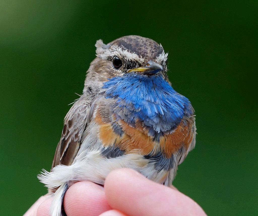 Our ringing teams work hard throughout the year, monitoring our bird populations in a way which would be impossible by purely visual observation. They also provide key data to the national BTO database, which enables population trends to be estimated and thus give early warning of any potential declines. Already this year, around 2,200 birds have been ringed on Nos.1 and 3 beds, with the peak periods for ringing still to come. Every now and then our teams’ efforts are given an extra frisson of excitement when something special turns up in their nets. Last year, the highlight was a Penduline Tit on No.3 bed and today Kieran Foster was thrilled to find a male White-spotted Bluethroat in one of his nets on the same bed. This race of Bluethroat breeds in southern and central Europe and winters in Africa. Intriguingly, this individual was in heavy wing and tail moult, so probably hadn’t come from too far away and might well stay until its moult is complete, before heading south to its wintering grounds. This is only the second record of White-spotted Bluethroat for Cheshire and the Wirral and yes, you guessed it, the first was also from Woolston, being ringed on No.1 bed in July 1996! Photo of the Bluethroat Cheers David Bowman (with Dan Owen and Helen Wynn)