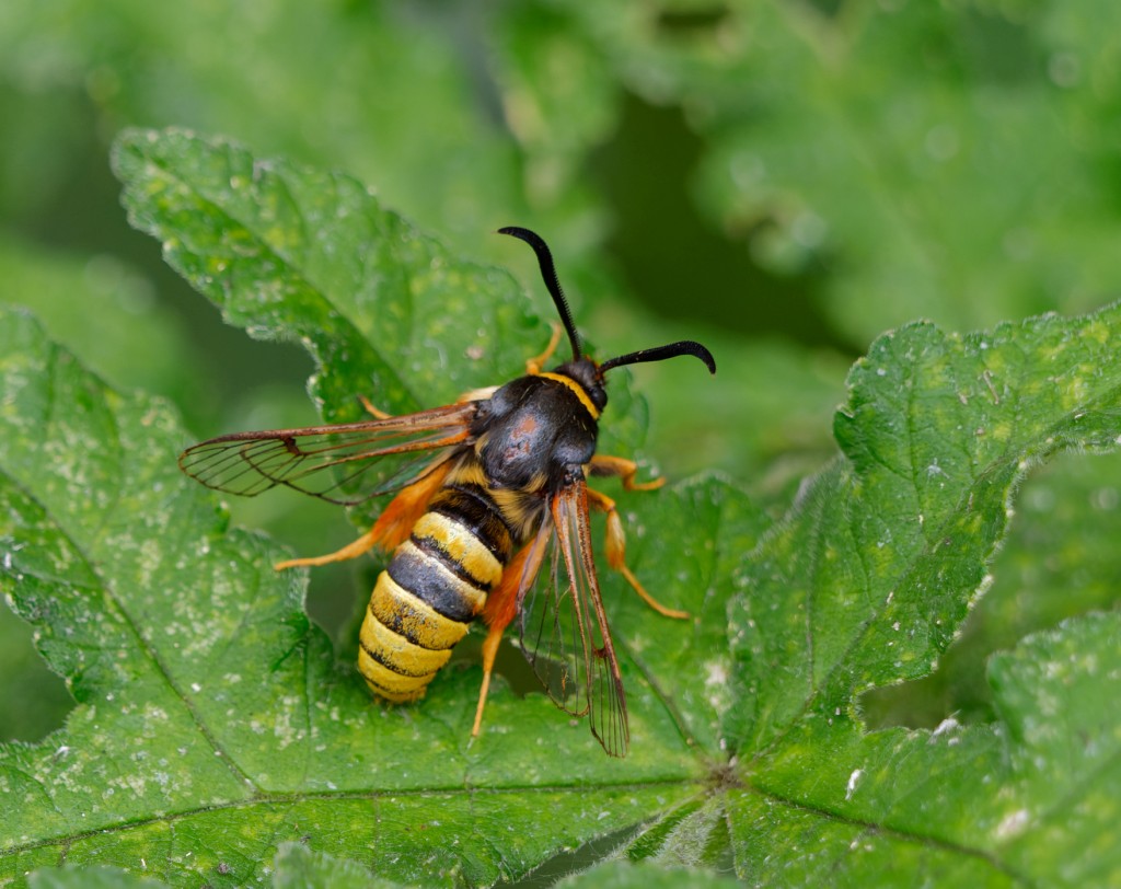 A muggy, high summer’s day started with plenty of good birds and finished with a couple of nice surprises. The best of the early action was on No.4 bed, where a couple of Little Egrets, 4 Green Sandpipers, 15 Black-necked Grebes, a family party of 3 Ravens and at least 10 Garganey were the highlights. Also of note was a single, worn Ringlet around The Loop. Over on No.3 bed, records included 2 Common Sandpipers, 4 more Garganey, Hobby, Garden Warbler and Marsh Harrier, with the best still to come. Over the past week or so, sharp-eared Dan Owen has heard the distinctive reeling sound of a couple of the scarce Roesel’s Bush-cricket, a species which is of a southerly distribution but has been steadily moving northwards, though still scarce in Cheshire and is a first for the Reserve. Today, he managed to track one down, a male, which we managed to see well and photograph. Then we moved on to moths! Clearwing moths are a family of day-flying moths, which mimic wasps to avoid predation and which are both scarce and very difficult to see. In 47 years on the Reserve, I’ve only managed to see two - one each of Lunar Hornet Moth and Red-tipped Clearwing. They do, however, come easily to pheromone lures, something we’ve been meaning to do for ages. Today we finally did it and were blown away when 10 Lunar Hornet Moths came rapidly to the lure. Given that they breed in stands of Willow and Sallow, which are extensive here, who knows how large our population might be? Photo of a Lunar Hornet Moth Cheers David Bowman (with Dan Owen)