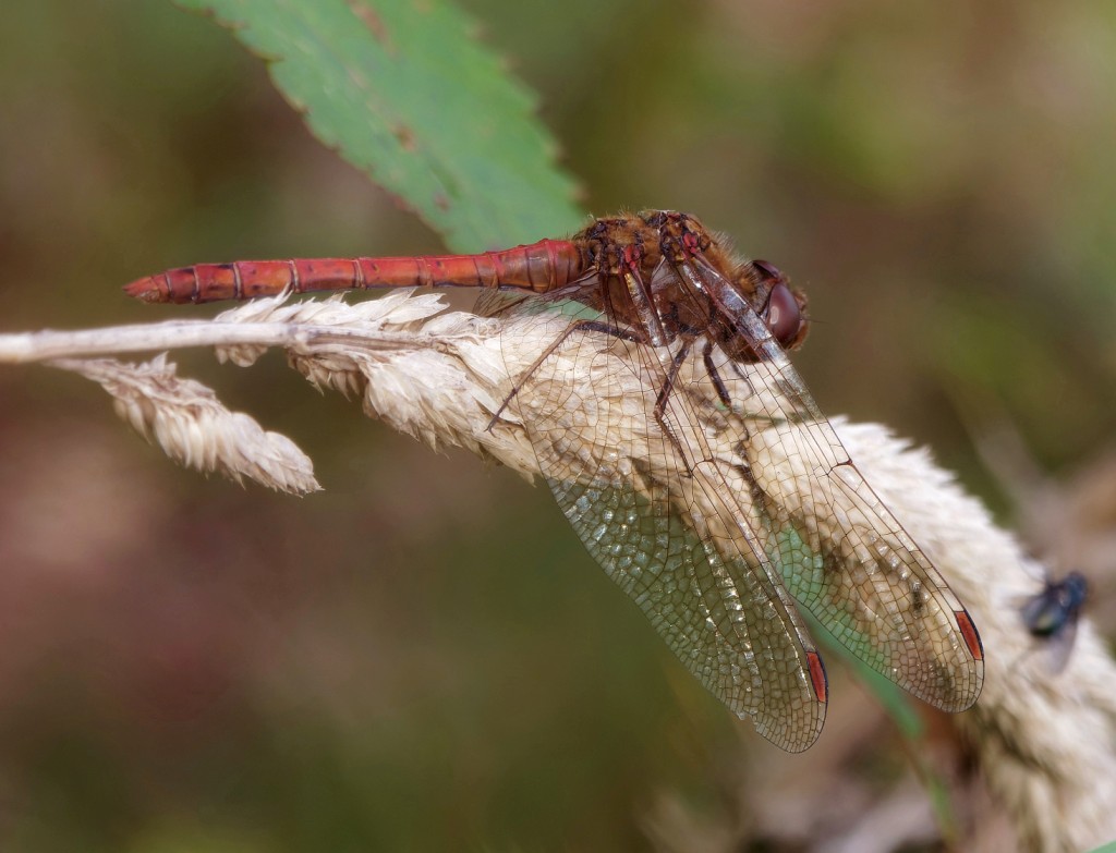 Though cool at first this morning, the day gradually warmed to a spring-like 20 degrees C by lunchtime. We’re in the last throes of of the crossover period between departing summer migrants and arriving winter visitors, with two juvenile Hobbies hawking for dragonflies over No.4 bed representing the former and 1,400 Pink-footed Geese, flying south-east, carrying the flag for the latter. Of our resident species, Cetti’s Warblers were triggered into song by the unseasonal warmth, with 13 belting out their explosive songs from around Beds 3 and 4. Other counts of note included 4 Siskins and 10 Reed Buntings around the Bed 3 seed crop and 70 Shovelers in front of the Morgan Hide. Bed 4 held hundreds of wildfowl and we’ll get a better handle on the numbers present when we do the coordinated Wetland Birds Survey (WeBS) next Saturday. By late morning we were taking advantage of the lovely conditions by counting the dragonflies around the East Cell of the Bed 4 wetland, with 6 Migrant Hawkers and 52 Common Darters both good totals for October. It won’t be too long till we’re bidding “au revoir” to our dragonflies for another year, so it was good to see so many on the wing. Photo of a male Common Darter Cheers David Bowman (with Helen Wynn, Brian Baird, Sue Haddock and Brian Martin)