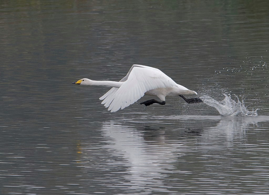 With rain overnight, a dawn fog clearing to blue skies by mid-morning and a light south-easterly breeze, it always looked good for something interesting turning up. Visibility was poor until around 9.00 am, with just a Little Egret drifting through the mist but things soon picked up, with a Stonechat bobbing up in the No.3 bed seed crop, plus 18 Fieldfares, 60 Redwings and 200 Pink-footed Geese passing overhead. Bird of the morning, though, was the single Whooper Swan which dropped in front of the Morgan Hide and looked settled till one of the local Mute Swans took exception to its presence and chased it off to the west. These attractive swans, with a triangular yellow flash on the bill, breed in Iceland and a few tens of thousands come to winter in the UK. They are uncommon visitors to the Reserve, so it was good to see one, if only briefly. Then a check of the finch flocks thronging around the bed produced some good counts, with 60 Greenfinches visiting the feeding stations and 120 Linnets, 100 Goldfinches and 80 Chaffinches visiting the seed crop, along with 25 Reed Buntings. Photo of the Whooper Swan Cheers David Bowman