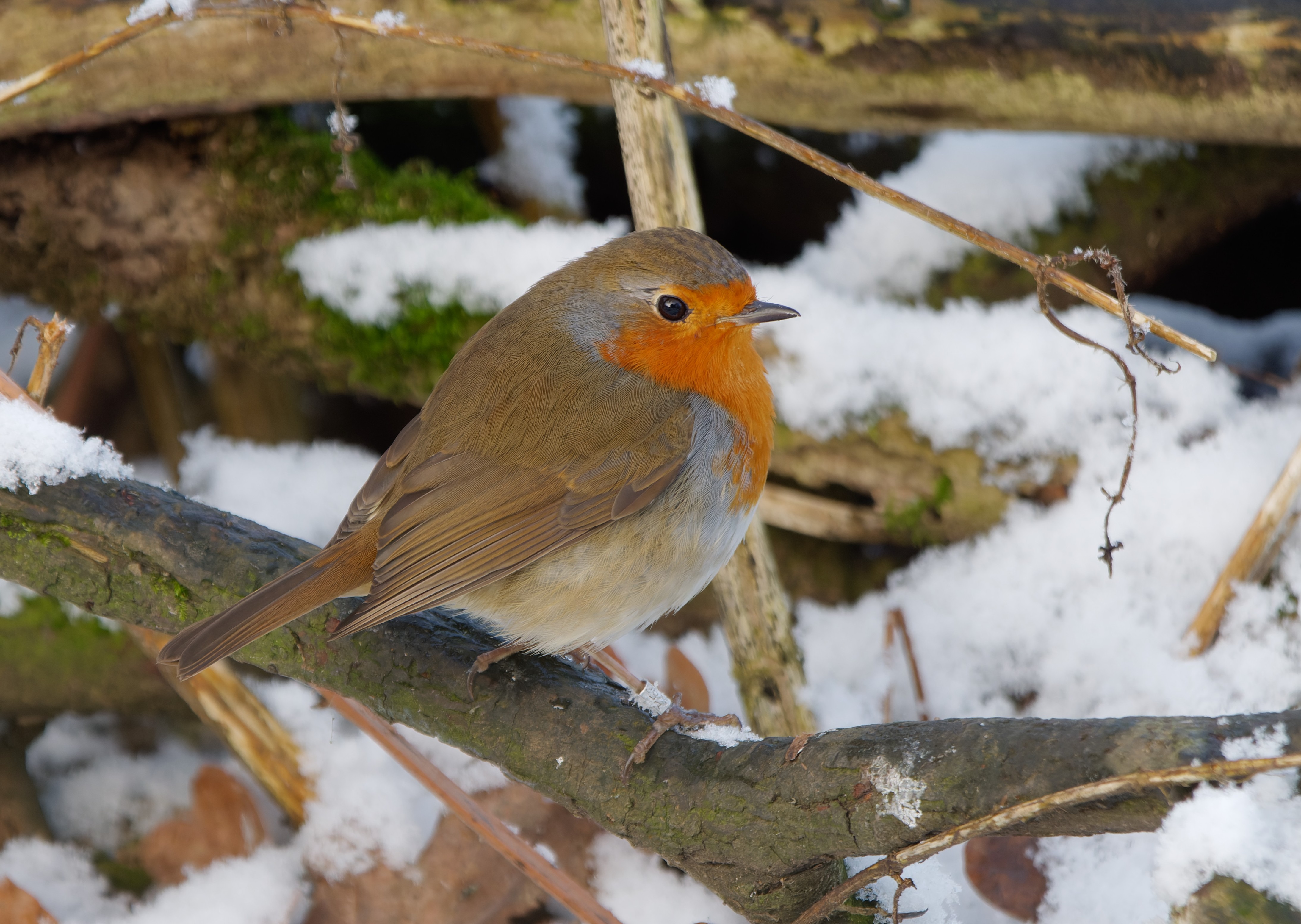 Nice to wake up this morning to a fresh fall of snow, though the freezing conditions inevitably affect the wetland bird populations at Woolston Eyes. Since the last spell of freezing weather, wildfowl numbers had slowly built up again and we recorded nearly 2,200 ‘water-birds’ during Saturday’s Wetland Birds Survey (WeBS). Today both Beds 3 and 4 were almost completely frozen, with wildfowl working hard to keep a couple of small pools open on the latter. While significant numbers have moved off, no doubt moving to the coast, we still managed a decent count, with: 4 Pintail, 5 Wigeon, 5 Snipe, 7 Little Grebes, 1 Pochard, 54 Shoveler, 60Teal and 235 Coot. Other sightings of note included: 2 Stonechats, 1 Willow Tit, 2 Chiffchaffs, 1 Marsh Harrier, 1 Peregrine, 10 Fieldfares, 20 Redwings and 42 Skylarks. Photo of a Robin Cheers David Bowman (with Dan Owen)
