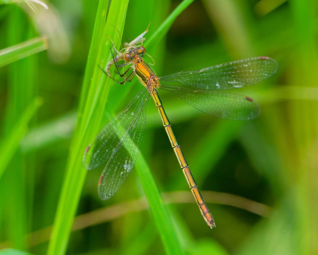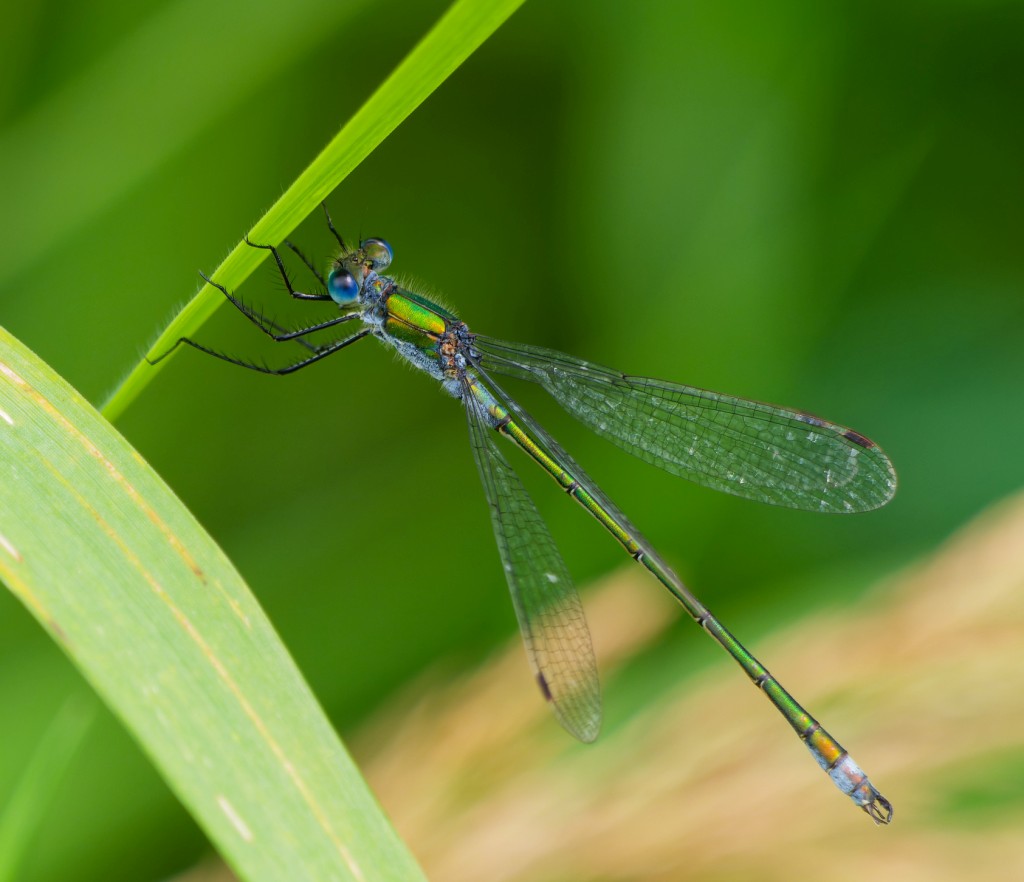 It was overcast and muggy this morning, with the sun breaking through by mid-morning and a warm, freshening breeze thankfully tempering the clamminess. It seemed pretty quiet on No.4 bed early on, though counts included 18 Black-necked Grebes, 4 Green Sandpipers, 5 Snipe, 80 Swifts and 95 Pochard. Interestingly, one of the Pochard was fitted with a nasal saddle, a colour-marking technique to help visually track wildfowl movements as an aid to conservation of declining species. Though we couldn’t read the code the colour indicated that it was marked as part of a scheme operating in France. Highlight of the day came when Dan heard Turnstones calling, swiftly followed by two which touched down briefly before flying west. While Turnstones are a common wader coastally, at the right time of year, they are scarce in-land and very hard to catch up with on the Reserve, with just a couple of sightings over the past decade. Raptors were represented by three Hobbies which flew west at speed and a couple of hunting Marsh Harriers. We finished the morning with a brief survey of dragonflies and butterflies. along the main track. Dragonfly totals were: 8 Emerald Damselflies, 3 Emperors, 2 Ruddy Darters, 1 Southern Hawker, 12 Common Darters, 40 Black-tailed Skimmers, 1 Common Blue Damselfly and 120 Blue-tailed Damselflies. Butterflies totalled: 13 Speckle Woods, 3 Commas, 2 Gatekeepers, 4 Red Admirals and 6 Small Whites. Photo of an immature male Emerald Damselfly Cheers David Bowman (with Dan Owen)