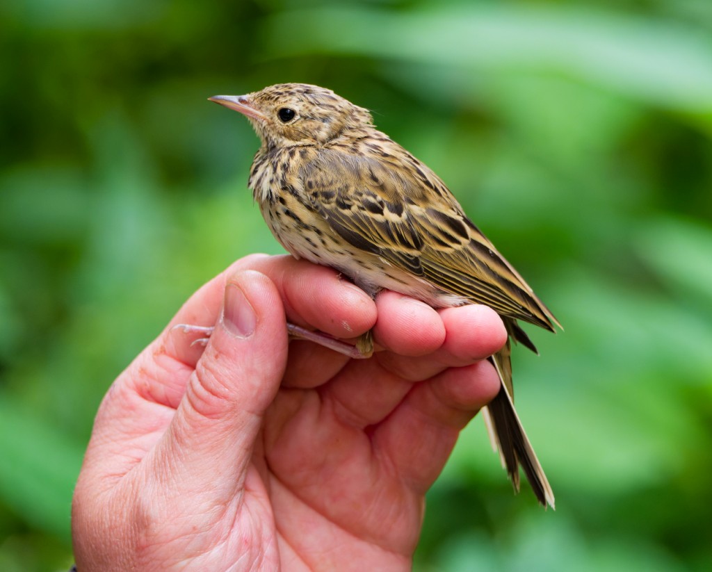 It’s been an interesting week, with a steady trickle of waders passing through and enough Reserve scarcities to keep us on our toes. Wednesday saw a second Pied Flycatcher turn up on No.1 bed, with two Turnstones on No.4 bed the following day. Yesterday’s surprise was a Tree Pipit which turned up in the ringers’ nets on No.3 bed. While not as uncommon as the previous two sightings, with a handful passing over during most return passage periods, it is always nice to see these smart but understated birds at close quarters. Saturday’s waders included two Little Ringed Plovers, three Common Sandpipers and four Green Sandpipers. The three Hobbies which were noted over No.4 bed, two adults and a first-summer individual, have been around all summer and are likely to be a local breeding pair, with a “helper”, which could be one of last year’s young. This occasional phenomenon, of an immature bird helping a mature, established pair by cooperatively hunting with them, is an intriguing aspect of Hobby breeding behaviour. Most impressive, though, were the numbers of water-birds crowding the lagoons, with a record count of 1,025 Gadwall plus 548 Coot and 20 Black-necked Grebes the highlights. Photo of the Tree Pipit Cheers David Bowman (with Dan Owen)