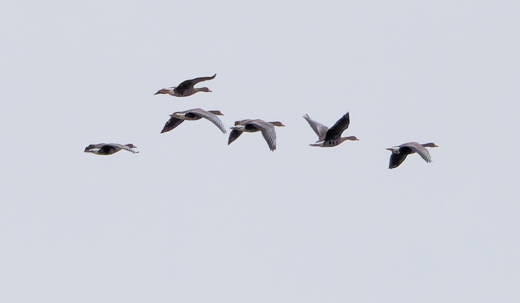 The plan was to conduct a visible migration session on No.1 bed, which started in solid enough fashion, with totals of: 840 Fieldfares, 865 Redwings, 96 Chaffinches and 1,390 Woodpigeons. While concentrating on observing and counting we were discussing the Reserve bird list for the year, which stood at 152 species, and wondering whether we’d be able to push it up to 155 by year-end. A large flock of Lapwing were then accompanied by a single Golden Plover, always a scarce bird at Woolston, pushing the total to 153. The outstanding highlight, though, was the group of 10 White-fronted Geese which Dan picked up coming straight over-head at speed. They looked like the Greenland sub-species, which winter in Wexford, Ireland, and Islay and are very rare in Cheshire. They constitute only the third record for the Reserve and the first for more than thirty years. As one was wearing a radio tag we may be able to get information on both its origin and movements. So, a total of 154. Getting home, we then heard that a male Hen Harrier had been reported, by David pencer, hunting the fields to the south of Butchersfield Tip, thus bringing up the hoped-for 155. Wonder what surprises the remainder of the year will bring? Record shot of the White-fronted Geese Cheers David Bowman (with Dan Owen and Helen Wynn)