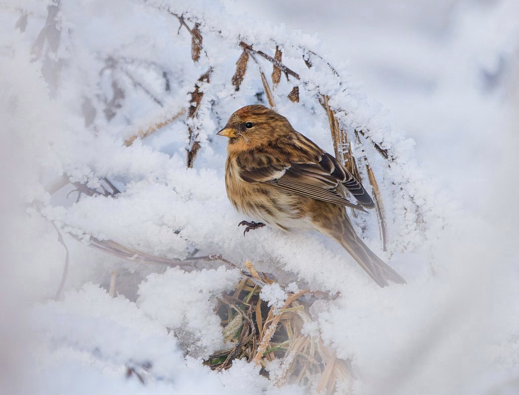 Although we cancelled Saturdays Wetland Birds Survey (WeBS) due to the treacherous conditions underfoot, it was still a spectacular morning to be out birding. It was -7 degrees when we arrived at dawn and the trees and reeds were heavily rhimed with frost. The sun quickly burned through the early morning mist and it was then blue skies all the way. The shallowness of all the lagoons on the Reserve contributes to the rich feeding which attracts so many feeding water-birds. The converse of this is that they are quick to freeze over in sustained sub-zero weather and such was the case yesterday. One advantage of the snow cover, though, is that it provides an opportunity to look for mammal tracks. On Beds 3 and 4 Fox and Badger tracks were evident wherever we walked and a lone Fox spent time looking for prey out on the frozen No.4 bed wetland. Interestingly, during the week Roe Deer tracks were found on No.3 bed, something more usually encountered on Nos.1 and 2 beds. Birds noted included: 2 Goosanders. 1 Chiffchaff, 3 Marsh Harriers, displaying Sparrowhawks, 6 Cetti’s Warblers, 4 Siskins, 6 Redpolls, 60 Redwings and 4 Fieldfare. The highlight, though, was the Woodcock which flew straight in front of the window of the Morgan Hide. We finished a spectacular morning with a count of the few hundred wildfowl and gulls which were gathered on a small unfrozen area of the Ship Canal, with the temperature still just below zero. Photo of a Lesser Redpoll Cheers David Bowman (with Dan Owen)