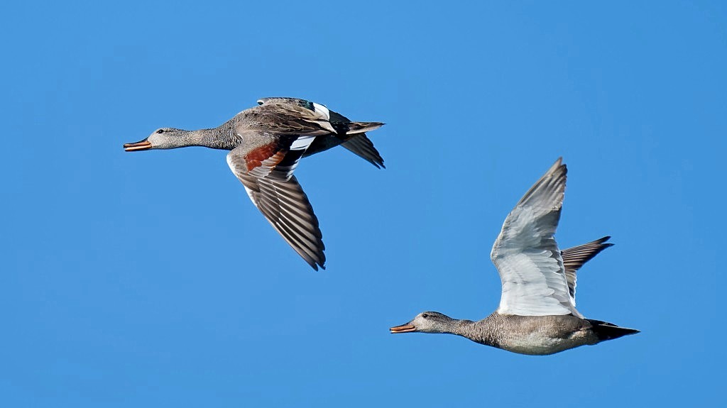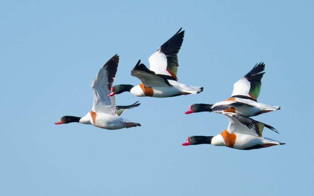 Yesterday brought some excitement to the Reserve, as David Spencer found a rare avian visitor on No.4 bed. He heard the distinctive fluting song of a Golden Oriole coming from the flooded woodland at the southern end of the wetland. Although the males, which this was, are Blackbird-sized and bright canary yellow, they are incredibly skulking and hard to see. They are summer migrants, wintering in Africa and breeding across temperate and southern continental Europe. After hours of diligent searching he eventually managed to see it and let other people know. We then spent a pleasant evening in the sunshine watching it, in some distant tall Willows, feeding on large caterpillars. Despite a frosty, dawn arrival this morning we were unable to relocate it, which is typical, as they rarely stay long before re-orienting themselves and heading back south. This was only the third record for the Reserve and a welcome addition to the year’s list. Other sightings over the two days included Wood Sandpiper, 2 Whinchats, Barn Owl, Little Egret and Yellow-legged Gull. Photo of Shelduck in courtship chase. Cheers David Bowman (with Dan Owen, David Spencer et al)