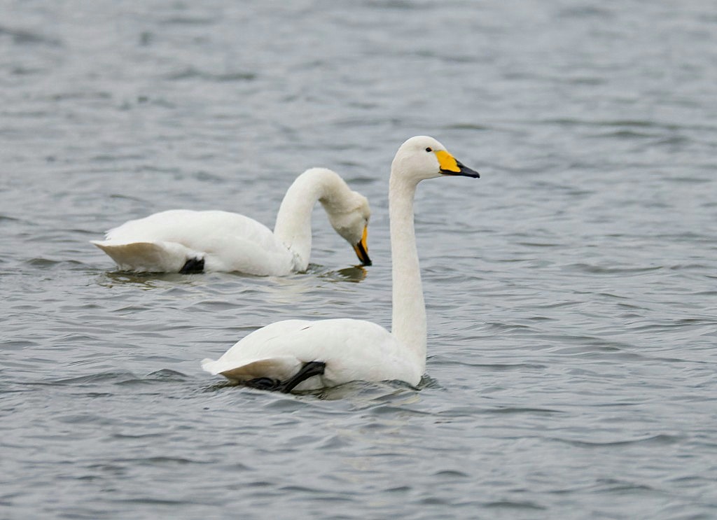It’s been a week of contrasts, with the beds largely frozen on Saturday before milder, wetter weather moved in this morning. With No.3 bed holding few wildfowl on Saturday we decided to do a count along the River Mersey, from the Weir Basin and further east along the river. There were plenty of wildfowl, with counts of: 2 Goldeneyes, 6 Shelduck, 38 Shoveler, 100 Teal, 83 Mallard, 46 Tufted Ducks, 16 Gadwall, 1 Great Crested Grebe and 3 Little Grebes. In addition, the trees and bushes lining the footpath along the north bank of the river were thronging with feeding birds, including 1 female Blackcap, 10 Fieldfares, 60 Redwings and 48 Blackbirds. This morning started with a heavy overcast and the odd shower before clearing towards lunchtime. Wildfowl are slowly returning to the beds, with the highlight being two Whooper Swans found on No.4 bed by Jasmine Smith. Photo of the Whooper Swans Cheers David Bowman